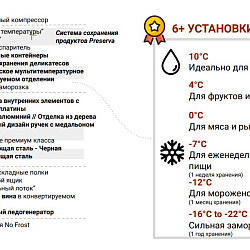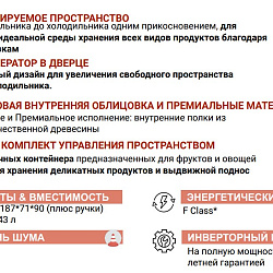 Конвертируемое пространство в морозильной камере позволяет вам переключиться на любую из 6 предустановленных температур, чтобы лучше хранить ингредиенты и максимально использовать пространство для хранения. Инновационный диспенсер для воды и льда уникален, встроен в дверь, чтобы не уменьшить ценное пространство на полках. Разработанный для размещения любого ингредиента, который вам нужен для ваших кулинарных творений, интерьер нашего 4-дверного холодильника полностью гибкий, с регулируемыми полками, держателями для бутылок, ящиками Fresh Seal для фруктов и овощей и ящиком для деликатесов Независимо от того, нужно ли вам дополнительное место в холодильнике для особых случаев или место для мороженного в жаркую погоду, конвертируемое пространство в морозильной камере поможет вам. С более чем 6 предустановленными температурами вы можете хранить все, что угодно, от вина до фруктов, от мороженого до мяса. Ваши драгоценные ингредиенты прекрасно сохранятся: +10 ° C для вина +4 ° C для фруктов и овощей 0 ° C для мяса и рыбы -7 ° C для повседневного питания -12 ° C для мороженого и десерта -16 ° C / -22 ° C для замораживания Габариты : Ширина (мм) 908 Высота (мм) 1876 Глубина (мм) 716 Регулируемые ножки Да - только передние Индикатор открытия дверцы морозильной камеры Да Функция быстрого охлаждения Да Функция быстрой заморозки Да Общий объем морозильной камеры 254 Сумма объемов замороженных отсеков 237 Дренажная система Да Система No Frost - Полная Выключатель внутреннего освещения Да Количество регулируемых полок в холодильной камере 2 Количество отсеков 3 Количество компрессоров 1 Количество ящиков или корзин в морозильной камере 4 Количество полок в холодильной камере 2 Количество температурных зон 3 Полная вместимость холодильника (л) 401 Сумма объемов холодильных отделений 355 Срок хранения при отключении электроэнергии (ч) 15 Дисплей температуры морозильной камеры Цифровой Дисплей температуры холодильника Цифровой Общая вместимость прибора (л) 655 Общий объем продукта (л) 592 Тип управления Электронный Сигнализация неисправности/неисправности - Визуальная и звуковая |