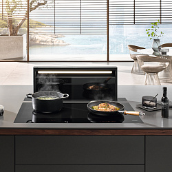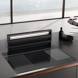 Встраиваемая в столешницу вытяжка в элегантном чёрном дизайне и с интуитивным управлением SmartControl Ширина 936 мм — идеальное сочетание с индукционными плитами. Простая установка в режиме рециркуляции с помощью комплекта аксессуаров Plug&Play. Моторизованный выдвижной паровой зонт - Hood in Motion Уникальная простота использования — Con@ctivity Эффективная фильтрация: 10-слойный металлический жироулавливающий фильтр из нержавеющей стали. |